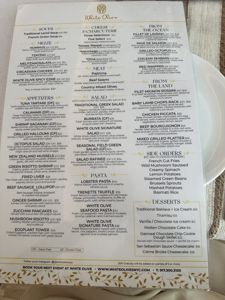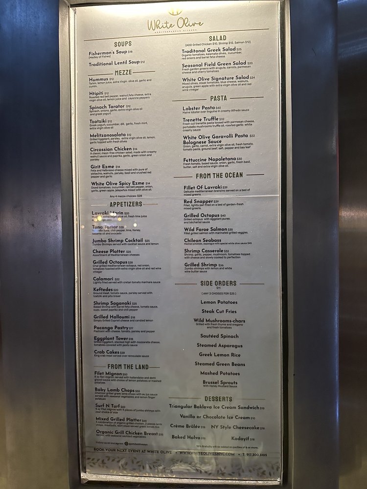 Introducing the menu at White Olive, a seafood restaurant located at 39 W 55th St, New York. Known for its classy ambiance and a variety of offerings, White Olive provides a range of mezze options including Circassians chicken, Girit Ezme, and Htipiti. Appetizers like the Beef sausage lollipop and Ginger shrimp are sure to tantalize your taste buds. For soup lovers, options like the Fisherman's Soup and Traditional Lentil Soup are available. The restaurant also offers amenities such as outdoor seating, free Wi-Fi, and a full bar. With a diverse menu and impeccable service, White Olive is a must-visit for seafood enthusiasts looking for a memorable dining experience.